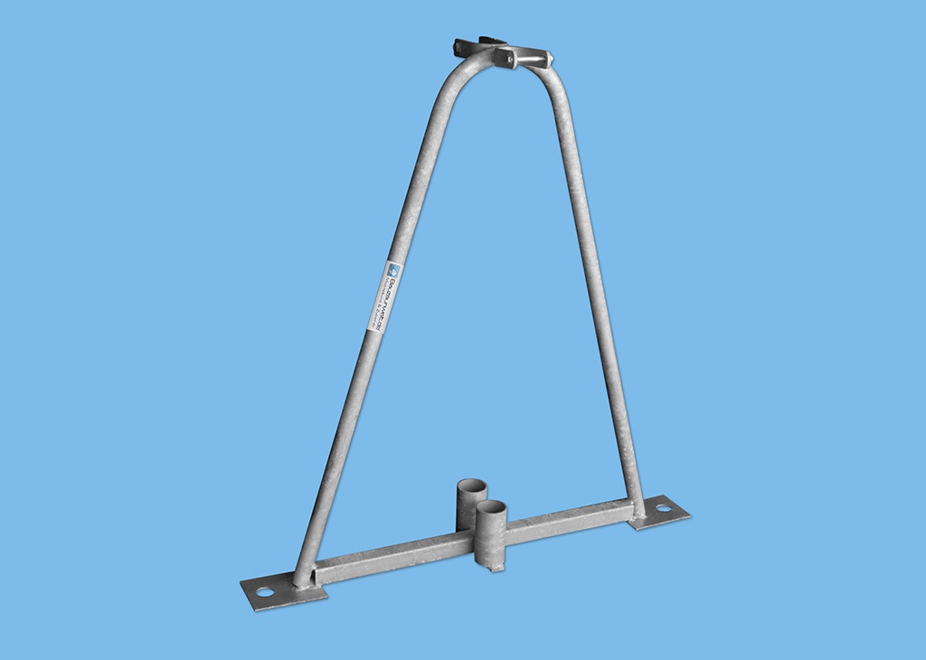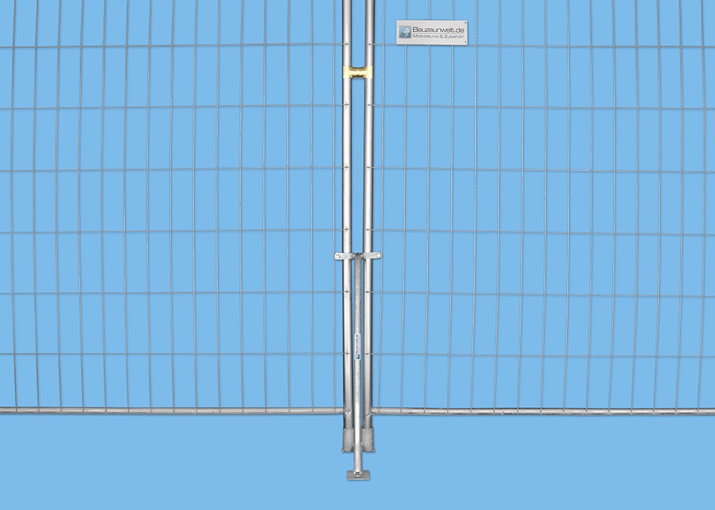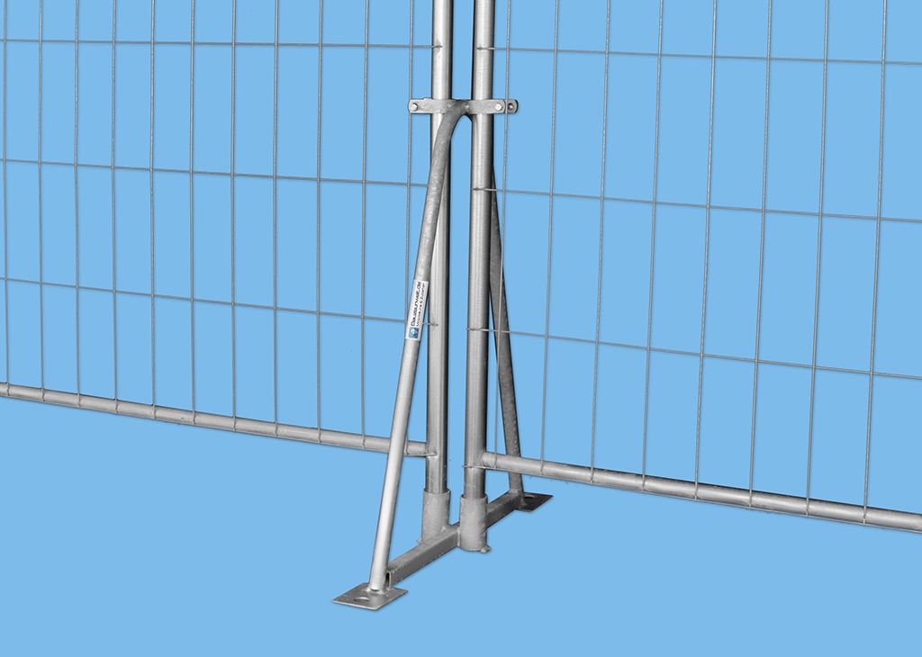 Stojak do ogrodzeń budowlanych to konstrukcja ze stali ocynkowanej z tulejami do włożenia rur stojakowych ogrodzeniowych oraz wspornikami do połączenia ze sobą 2 ogrodzeń budowlanych (patrz zdjęcie), na 2 płytach podstawy znajdują się otwory do wbicia gwoździ lub kołków o dużej wytrzymałości ( kotwy stałe/śrubowe) do mocowania stojaka do podłoża.