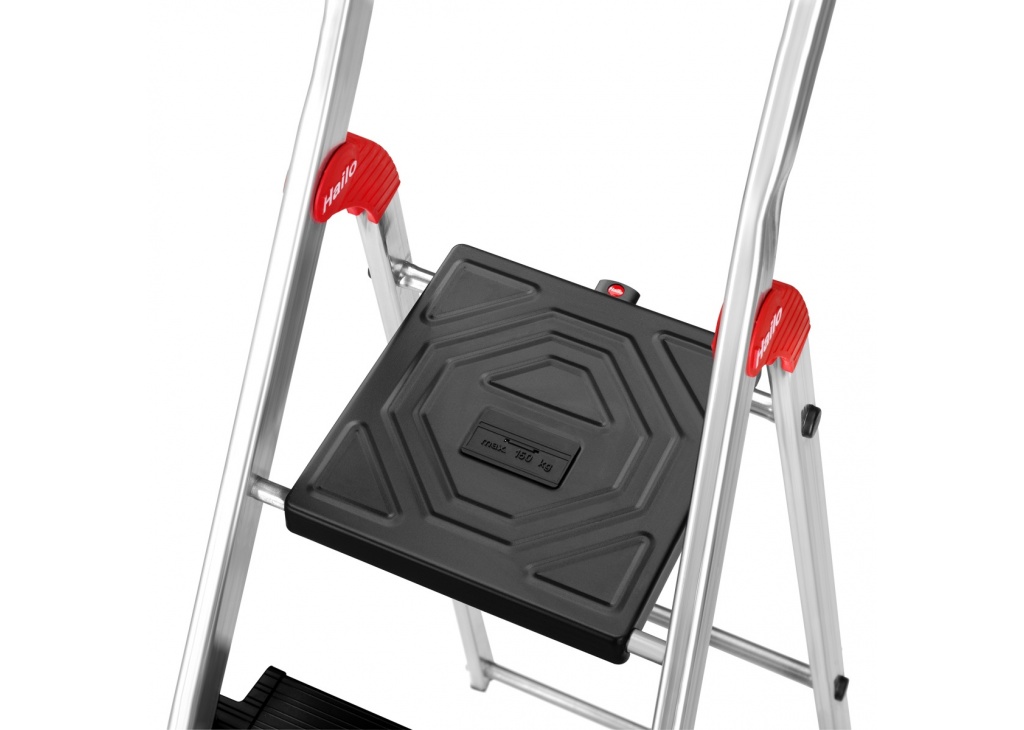 Die Alu-Sicherheits-Stehleiter mit Multifunktions- Schale, Sicherheits-Haltebügel und Plattformverriegelung bietet Sicherheit im XXL Format: 130 mm extra tiefe Stufen. Geeignet für Hailo EasyClix Wechselfüße (optionales Zubehör) Plattformverriegelung für sicheres Ver- und Entriegeln Schwarze XXL-Alu-Stufen mit Anti-Rutsch- Riffelung und extra tiefer Standfläche Verzinkte, schwarze Stahl-Plattform mit Anti- Rutsch-Riffelung Ausziehbarer Sicherheits-Haltebügel zum Festhalten beim Arbeiten auf der Plattform Multifunktions-Ablageschale zur Ablage von Werkzeugen, Farbdosen oder Kleinteilen Eimerschlaufe mit Klick-Schnellverschluss zur sicheren Befestigung von Eimern, Staubsaugern oder Kabeltrommeln 2 Universalhaken als Halterung für Heckenscheren, Putzmittel oder Malerrollen 1 Stabhalter als Halterung für Besen oder Pflücker Sichere, HighTech-vernietete Holm-Stufenverbindung Stufe zusätzlich mit Eckaussteifungen versehen Rutschsicherer Steckfuß Belastbar bis 150 kg