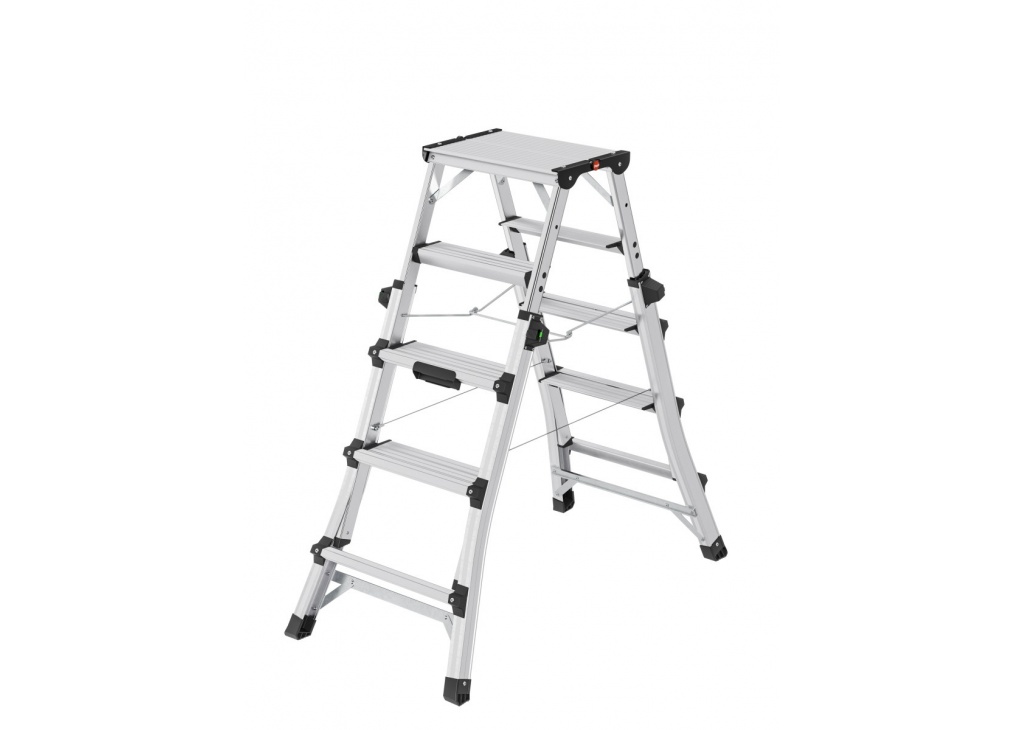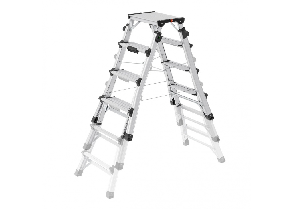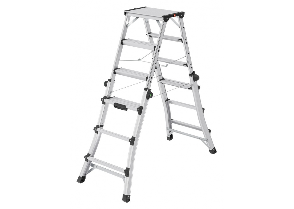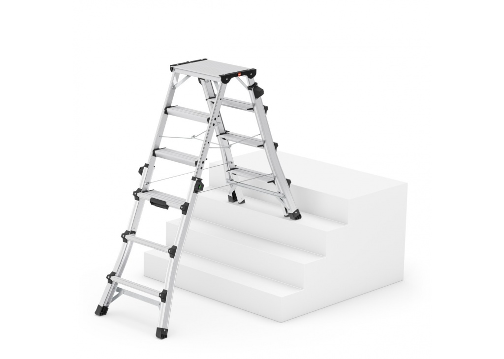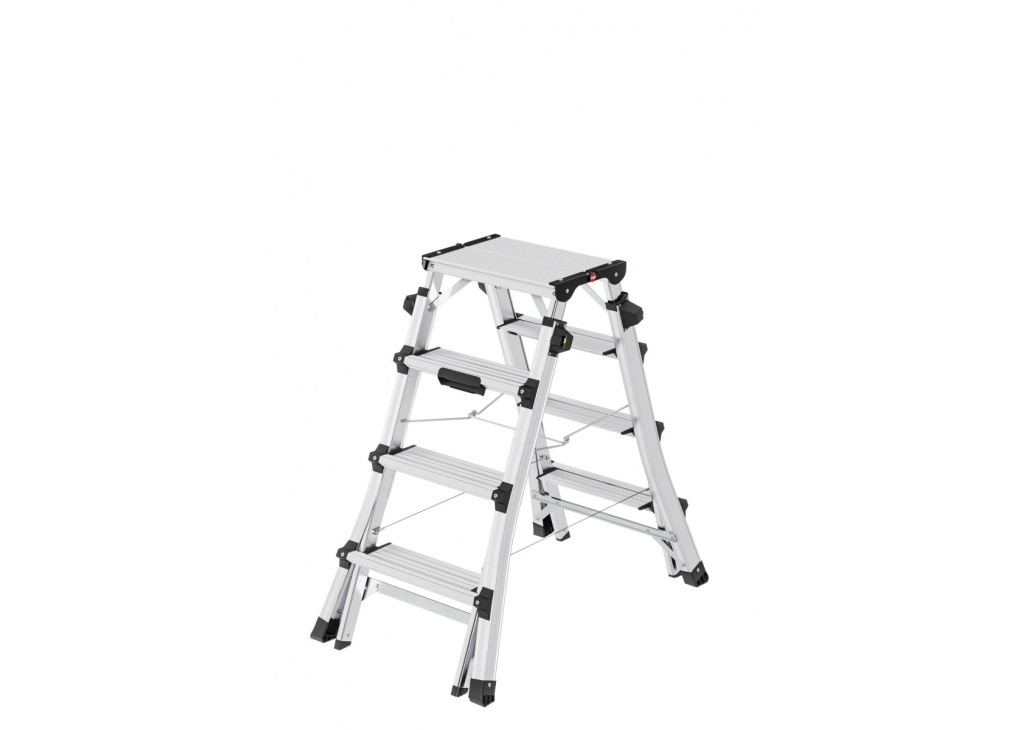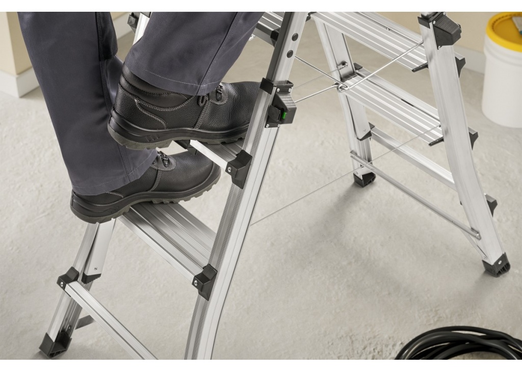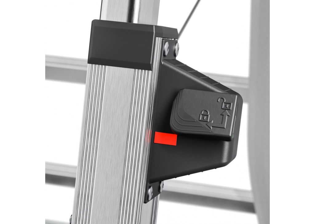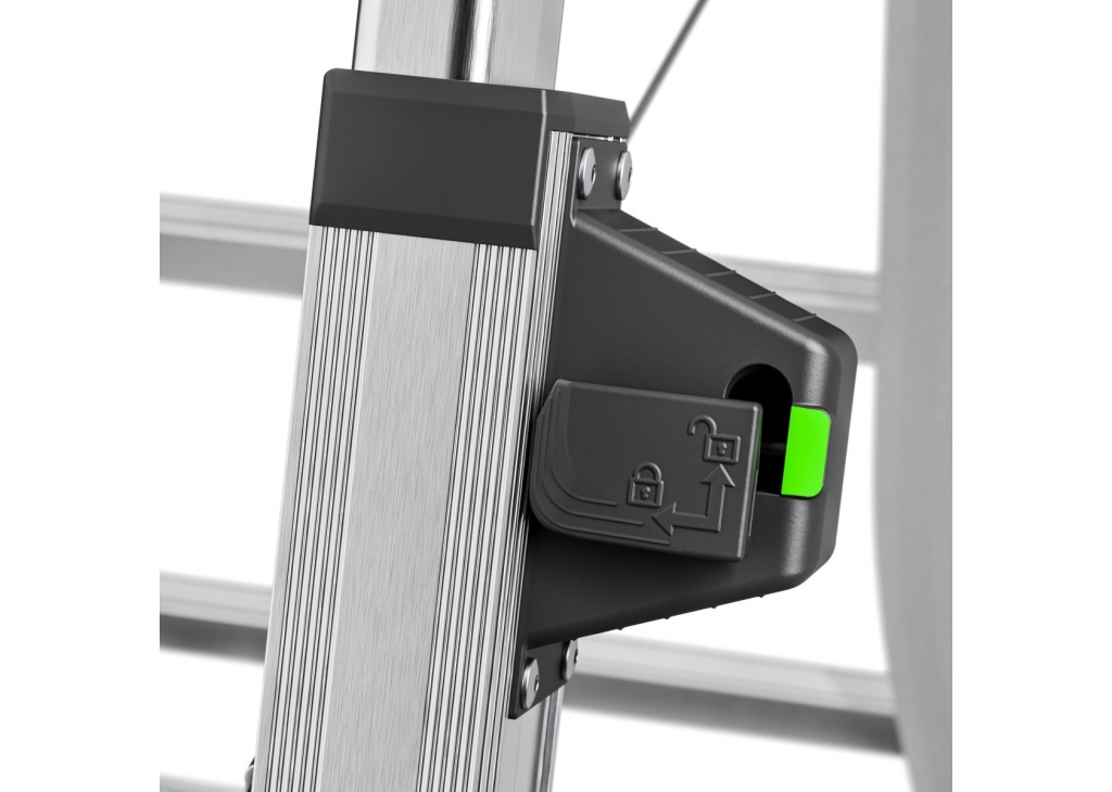 Teleskopierbare Holme Sicherheits-Verriegelungs-System (der Teleskopelemente) mit "Lock/Unlock“-Indikator Beidseitig besteigbar Material: Aluminium / Kunststoff Auf Treppenstufen einsetzbar Rutschsicher geriffelte Stufen-/Sprossen-Kombination Oberste und unterste Stufe mit Eckversteifungen für mehr Stabilität Platzsparend zusammenklapp- und -schiebbar Stufen/Sprossen und Holme aus eloxiertem Aluminium Druck-und zugfeste Spreizsicherung 2 stabile Spannseile Rutschsichere Kunststoff-Füße Belastbar bis 150 kg