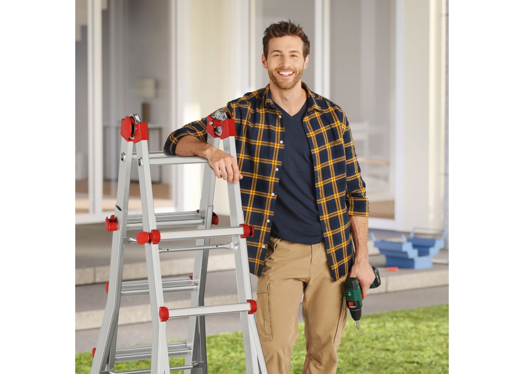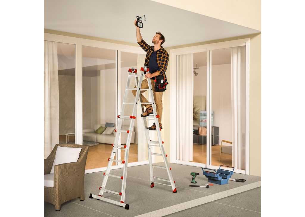Die variierbare Alu-Multifunktionleiter. Zusammenschiebbar, mit Sicherheitsgelenken und Rastgriffen zur Höhenverstellung. Verwendbar als Anlege- und Schiebeleiter, beidseitige Steh- und Treppenleiter Automatisches Blockier-System Höhe einstellbar durch seitliche Blockiergriffe 2 Sicherheitsgelenke (ent- und verriegelbar) für die Einstellung in Steh- und Anlegeleiter Sprosse für Sprosse höhenverstellbar Ab 4 × 4 Sprossen mit standsicherem Querbalken Rutschfeste Zweikomponenten-Kunststoff-Füße Belastbar bis 150 kg