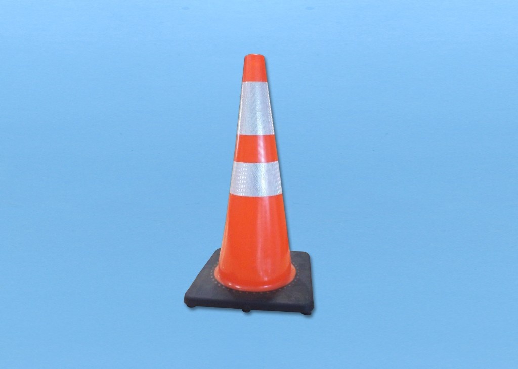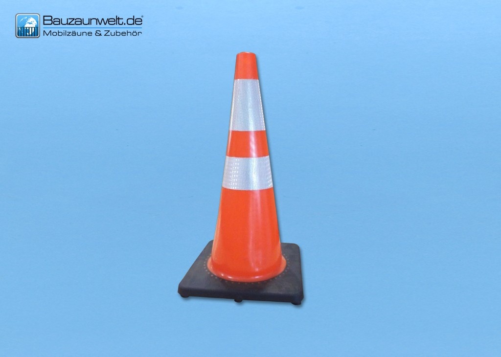 Stożek drogowy/stożek ostrzegawczy pomarańczowy z folią odblaskową RA2, wykonany z mocnego materiału PVC z podstawą zapewniającą dobrą stabilność, waży 2,5 kg.